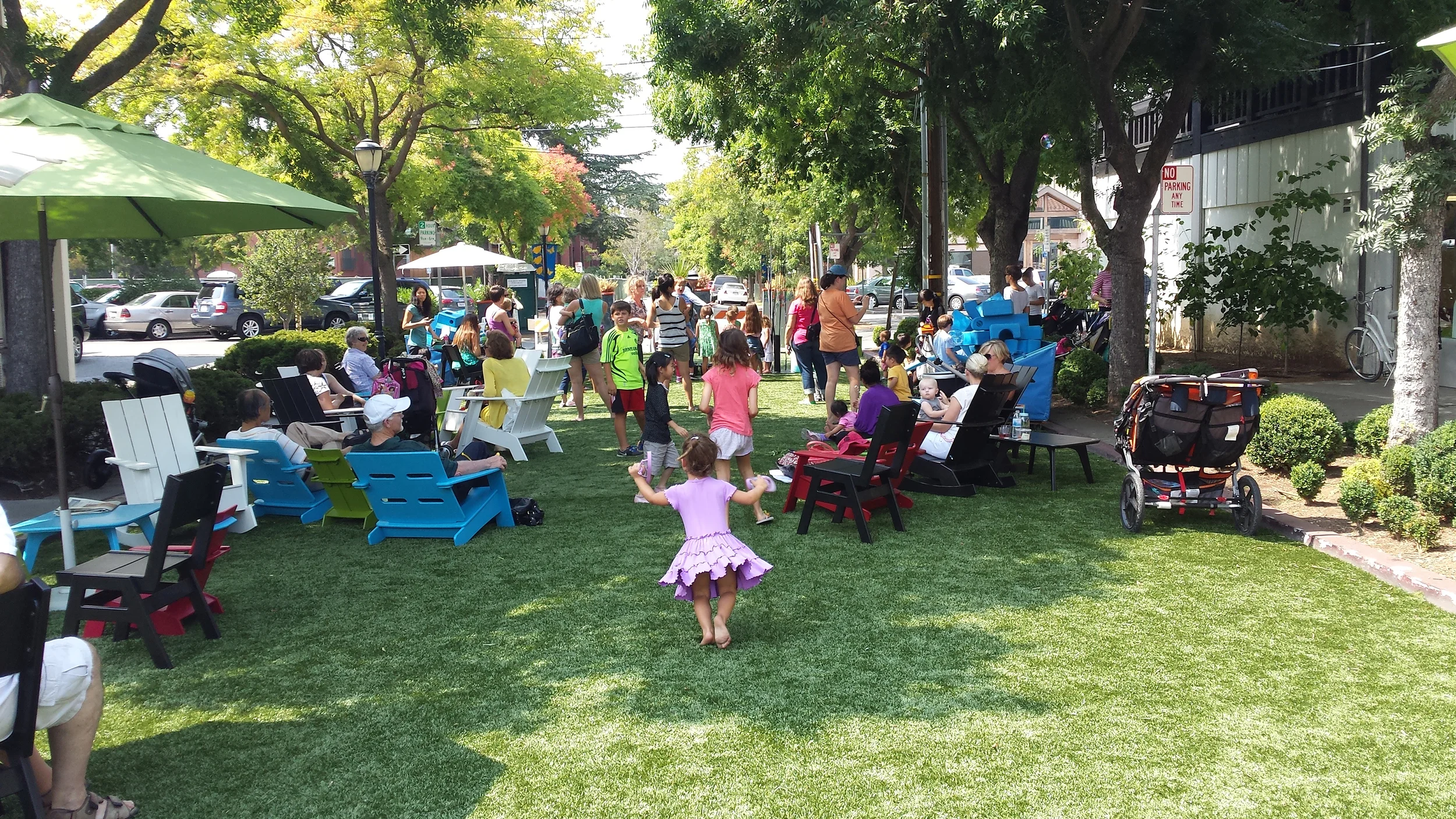 The Third Street Green was a temporary pop-up park in downtown Los Altos from August 3rd through 31st, 2014 in downtown Los Altos. Located on Third Street between State Street and Plaza North (between Tour Eiffel restaurant and Red Racer Hobby Shop), it featured approximately 2,500 square feet of synthetic turf, Adirondack chairs and tables for both kids and adults, shade umbrellas, and a nighttime dynamic lighting installation in the street trees overhanging the space. In addition, the Green played host to daily activities and special events for all to enjoy throughout the month of August.